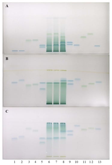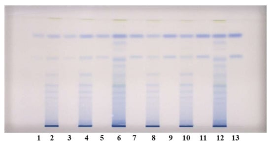 As can be seen in Figure 2, this method does not enable the separation of standards for monomers ((+)-catechin (track 9) and (−)-epicatechin (track 5)), and the separation of (−)-gallocatechin (track 9) and (−)-epigallocatechin (track 5). However, intensive blue bands in tracks of all STSs (tracks 6–8) from leaves at RF of monomers ((+)-catechin and (−)-epicatechin) confirmed the presence of monomers in leaves of all studied knotweeds. Dimer procyanidin B2 (track 12) was detected based on the standard in STSs from all studied species, with intensive blue bands in tracks of STSs from Japanese (track 6, Figure 2) and Bohemian (track 7, Figure 2) knotweed and slightly less intensive bands in the track of STS from giant knotweed (track 8, Figure 2). (−)-Epicatechin gallate (track 10), dimer procyanidin B1 (track 11) and trimer procyanidin C1 (track 3) were detected based on the corresponding standards only in leaves of giant knotweed (Figure 2). Based on other applied standards (−)-catechin gallate (track 2), (−)-gallocatechin (track 9), (−)-epigallocatechin (track 5), (−)-epigallocatechin gallate (track 13) and dimer procyanidin B3 (track 4) were not detected in STSs from leaves (tracks 6–8). Due to the limitation of silica gel stationary phase in separation of some of the studied compounds, further examinations were performed on HPTLC cellulose plates (Figure 3), which were developed based on the previously developed methodology [17,18,19], which provided complementary results.
