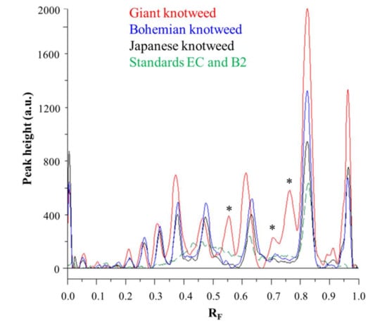 Comparison of videodensitogram fingerprint profiles of STSs (1 μL, 50 mg/mL) from leaves of Japanese, Bohemian and giant knotweed with videodensitogram of standards (−)-epicatechin (EC; RF = 0.82) and procyanidin B2 (B2; RF = 0.63) (30 ng; dashed green line). Videodensitograms were obtained in absorption mode by images analysis of HPTLC silica gel plates after development with developing solvent toluene–acetone–formic acid (3:6:1, v/v) and after derivatization with DMACA detection reagent. Asterisks (*) indicate peaks that are specific to giant knotweed leaves.