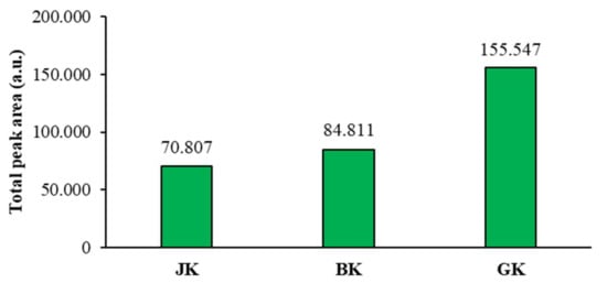 Comparison of the mean of the total peak areas of proanthocyanidins (blue bands in chromatograms) for STSs from leaves of Japanese (JK), Bohemian (BK), and giant (GK) knotweed. The mean of the total peak areas was calculated from the total peak areas of videodensitograms of two equal applications of the same STS on HPTLC silica gel plates (Figure 4) after development with developing solvent toluene-acetone-formic acid (3:6:1, v/v) and after derivatization with DMACA detection reagent.