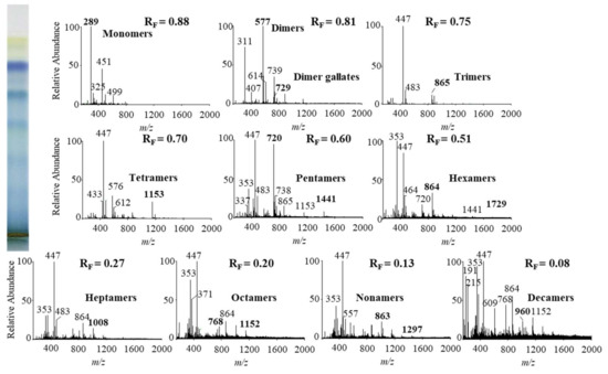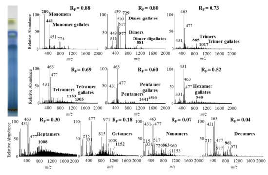 MS spectra obtained by HPTLC-MS analyses of STS from Japanese knotweed leaves on HPTLC diol F254S plate pre-developed and developed with acetonitrile. The bolded m/z values in the MS spectra belong to B-type proanthocyanidins and their gallates, which were eluted from the plate with acetonitrile–methanol (2:1, v/v). A part of the plate was derivatized with DMACA reagent.