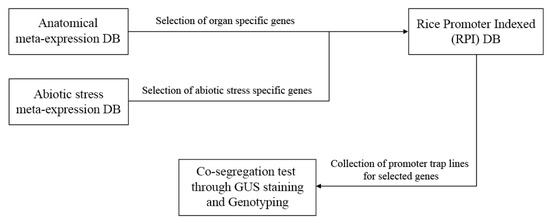 In the present study, we explored a new approach to identifying novel genes using transcriptome data and promoter trap lines. Initially, we selected 700 organ-specific or abiotic stress-specific genes using an anatomical and stress meta-expression database. Then, a rice promoter-indexed (RPI) database was used to search for potential promoter trap lines for the selected genes. GUS expression was tested for several genes by GUS staining and genotyping. Finally, previous reports of gene expression analysis with the promoter trap system in the funRiceGenes database were examined. The analysis process for the promoter trap line is summarized in Figure 1.