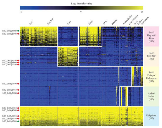 - Jung, K.-H.; Kim, S.-R.; Giong, H.-K.; Nguyen, M.X.; Koh, H.-J.; An, G. Genome-wide identification and functional analysis of genes expressed ubiquitously in rice. Mol. Plant 2015, 8, 276–289. [Google Scholar] [CrossRef] [PubMed][Green Version]