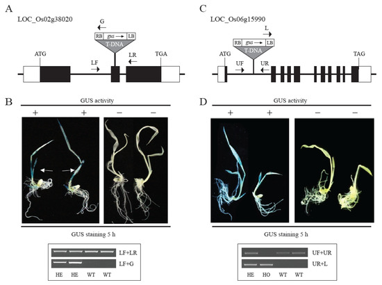 LOC_Os02g38020 is preferentially expressed in the leaves, and a relevant promoter trap line with T-DNA inserted in the second exon was identified (PFG 1C-011049, Figure 3A). To observe the GUS staining pattern of this gene, we performed GUS staining of plants grown in Murashige and Skoog (MS) medium for a week. As expected, we observed a leaf-preferred GUS staining pattern for this gene. Genotyping analysis revealed that the stained plants were heterozygous, and the unstained plants were wild-type (Figure 3B), indicating that the GUS expression data represent the endogenous expression of the target gene. LOC_Os06g15990 is expressed in all organs, and the T-DNA of PFG 3A-51959 is inserted in the first intron of the gene (Figure 3C). Using the same method mentioned above, GUS staining patterns were observed in the leaves and roots of plants (Figure 3D). Genotyping analysis also confirmed that all plants with GUS activity were heterozygous or homozygous. The two genes identified by GUS staining are indicated by green arrows in the heat map in Figure 2.