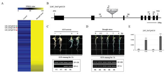 We identified 65 potential promoter trap lines for 100 drought-inducible genes in the RPI database. Among these, the promoter trap lines of one gene (PFG 3A-01968 for LOC_Os07g40320) exhibited GUS expression in roots after plants were exposed to drought stress for 0, 0.5, 1, 2, and 4 h (Figure 4D) [5]. To ensure the accuracy of our GUS expression analysis, GUS staining was performed for the same time after stress treatment, and all plants used were heterozygotes. Interestingly, the longer the exposure to drought stress, the stronger the observed GUS expression. This drought-related expression was verified by qRT-PCR (Figure 4E). Our findings show that the promoter trap system is very effective in identifying the activity of promoters and could also enable researchers to develop novel promoters.