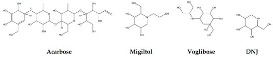 - Moorthy, N.S.; Ramos, M.J.; Fernandes, P.A. Studies on alpha-glucosidase inhibitors development: Magic molecules for the treatment of carbohydrate mediated diseases. Mini Rev. Med. Chem. 2012, 12, 713–720. [Google Scholar] [CrossRef]