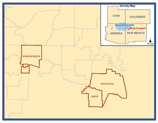 Participating chapters or communities (Churchrock and Baca/Haystack) on the Navajo Reservation in northwestern New Mexico. Inset shows their proximity to the Four Corners region of the USA.