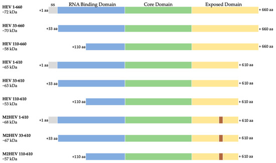 Schematic representation of the nine HEV constructs; ss–signal sequence (grey), RNA binding domain (blue), Core domain (green) and Exposed domain (yellow) containing the M2e peptide (brown) are presented as bars with different colors; 1. HEV 1–660 (full length construct); 2. HEV 33–660 (without leader sequences); 3. HEV 110–660 (N-terminal truncated); 4. HEV 1–610 (C-terminal truncated); 5. HEV 33–610 (C-terminal truncated without leader); 6. HEV 110–610 (N- and C-terminal truncated); 7. M2 HEV 1–610 (chimeric construct based on the C-terminal truncated construct); 8. M2 HEV 33–610 (chimeric construct based on the C-terminal truncated construct without leader); 9. M2 HEV 110–610 (chimeric construct based on the N- and C-terminal truncated construct).