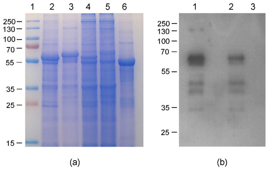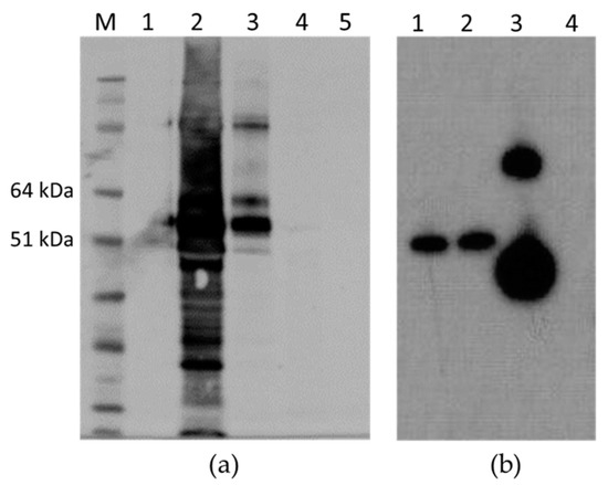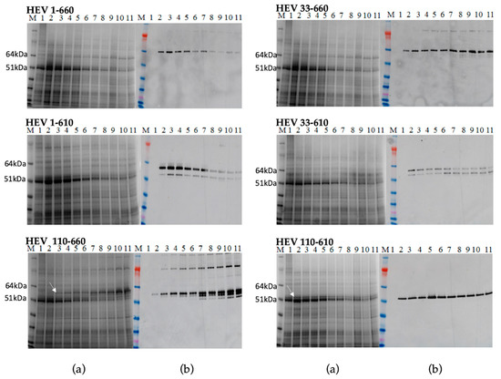 The antigenicity of the M2e peptide was maintained in all cases, i.e., M2 HEV 1–610, M2 HEV 33–610, and M2 110–610; Western blot with anti-M2 antibody resulted in a very strong recognition of the M2 HEV 110–610 chimeric protein (Figure 7).