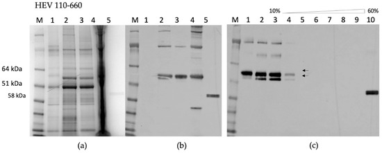 By contrast, HEV 110–660 was expressed highly in plant tissue, and is mostly soluble (Figure 3a). As found in the time course, it mainly consisted of products of 97 kDa, 58 kDa, and 53 kDa (Figure 3b). The protein mainly remains at the top of the sucrose gradient after centrifugation, suggesting that it does not assemble into VLPs (Figure 3c).