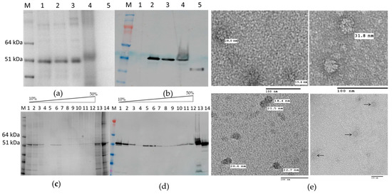 (a) SDS-PAGE gel and (b) Western blot of HEV 110–610 with anti-HEV ORF2 mAb; M. Molecular weight marker (kDa); 1. pEAQ-HT empty vector; 2. Crude extract; 3. SN (soluble protein) after extraction and spin; 4. Pellet-Insoluble part; 5. Positive control (HEV ORF2 452–617 aa recombinant protein); (c) SDS-PAGE of sucrose gradient fractions and (d) Western blot of fractions using anti-HEV ORF2 mAb; M. Molecular weight marker (kDa); 1 to 12 sucrose fractions from 10% to 60%; 13. Pellet; 14. SN after pelleting; (e) Electron microscopy of 30% (w/v) fraction and pellet.
