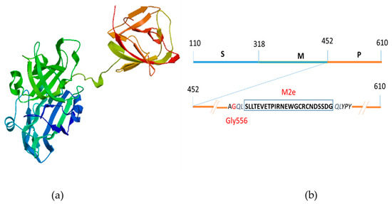 The P domain of HEV ORF2 capsid protein forms a β-barrel, consisting of nine antiparallel β-strands running from one end of the molecule to the other. There are three loops, which connect adjacent β-strands, including the following positions in the sequence: 480–490, 550–565, and 580–590. These three regions have been determined to be the most suitable sites for peptide insertion [28]. Based on our previous study [27], we constructed a fusion protein (Figure 5a) by inserting the 24 aa M2e antigenic peptide from the influenza A virus after residue Gly556 into the P domain of HEV (Figure 5b).