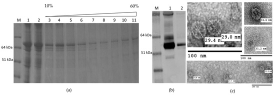 (a) SDS-PAGE of sucrose gradient of M2 HEV 110–610; M. Molecular weight marker (kDa); 1. TSP; 2. SN after spin the gradient; 3–10. Different sucrose fractions; 11. Pellet; (b) Western blot with anti-HEV ORF2 mAb; M. Molecular weight marker (kDa); 1. M2 HEV 110–610 supernatant 2. Fractions four to seven first were pooled and then sedimented by ultracentrifugation; (c) TEM of M2 HEV 110–610 after deliberate pelleting.