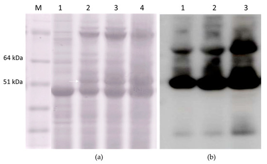 4.5. SDS-PAGE and Western Blot during the Protein Expression with pEAQ and pEff and Comparison