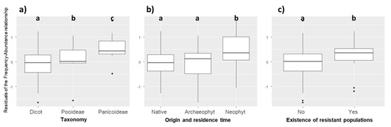 Distribution of the residuals of the frequency–abundance relationships based on (a) taxonomy (Kruskal–Wallis χ2 = 12.854, p = 0.002); (b) origin and residence time (Kruskal–Wallis χ2 = 6.534, p = 0.038); (c) existence of resistant populations (Kruskal–Wallis χ2 = 4.342, p = 0.037). Different letters indicate significant differences between groups (p < 0.05) based on post-hoc Dunn tests.