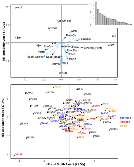Hill and Smith analysis axes 2 and 5. These two axes were displayed because regionally frequent and locally abundant species are positively correlated to Axis 2 and negatively correlated to Axis 5. Top panel displays species traits: Continuous traits are represented by a vector and attributes of qualitative traits are represented by a black dot. Bottom panel displays species. Species names are abbreviated by EPPO Codes (https://gd.eppo.int/). Red: Increasing species, blue: Decreasing species, orange: Stable species. black: Species for which the status cannot be determined. The position of the species is represented by a black dot. For the sake of readability, not all species are represented by a label. When two species overlapped, the most frequent one is represented.