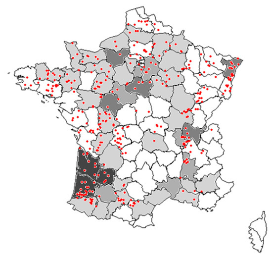 Map of surveyed fields in France. Departments in grey were those surveyed in the 1970s (with darker grey indicated more plots in this department; in white no survey). The red points indicate the locations of plots surveyed in the 2000s.