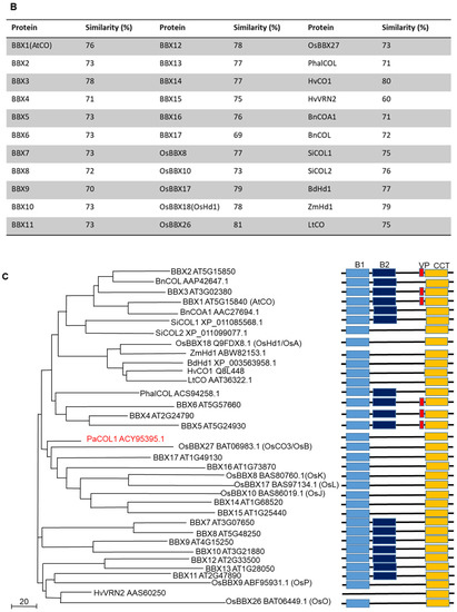 The genomic DNA (gDNA) of PaCOL1 is 945 bp, which splices into a 744-bp sense RNA product and encodes a protein with 247 amino acids of 27.9 kDa (Figure S1B). From the deduced amino acid sequence, we identified one B-box zinc finger domain near the N-terminal region and one CCT motif at the C-terminal region (Figure S1C,D). Also, the CCT motif included a putative nuclear localization sequence (NLS). Multiple sequence alignment was carried out with the Clustal Omega program with default parameters in the European Bioinformatics Institute toolbox (https://www.ebi.ac.uk/Tools/msa/clustalo/) (Figure 1A). The results revealed PaCOL1 with 69–78% and 60–81% similarity to Arabidopsis COL proteins and other plant COL proteins, respectively (Figure 1B). To investigate the evolutionary relationship among plant COLs, we constructed a phylogenetic tree by using the Mega6 software (http://megasoftware.net/) and unweighted pair-group method with arithmetic means (UPGMA) method. Phylogenetic tree analysis with other COL/BBX proteins from Arabidopsis, rape, sesame, rice, corn, grass, barley, darnel, and orchid revealed the sequence association as three major clades in the evolution (Figure 1C). The members of the PaCOL1 clade share a B-box domain and a CCT motif, which suggests that PaCOL1 shared the same sequence structures as the group 3 B-box protein family in Arabidopsis and rice.