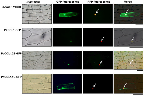 Subcellular localization of PaCOL1 full length, PaCOL1ΔB, and PaCOL1ΔC in onion epidermal cells. The fluorescent signal was examined at 20 h after bombardment. As controls, GFP expression vector and eIF4AIII-RFP fusion protein were used as indicators. Cell nuclei are indicated by an arrow. Scale bar = 200 µm.
