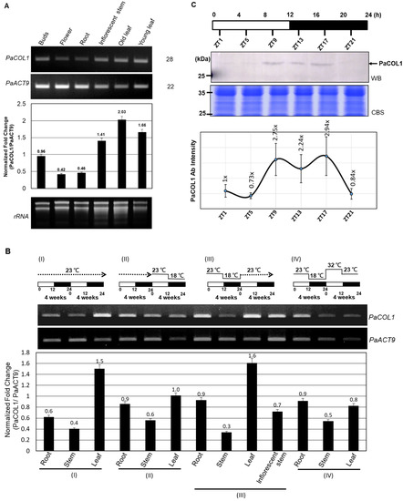 Expression profiles of PaCOL1 in P. aphrodite. (A) RT-PCR analysis of PaCOL1 in tissues of flowering plants grown under 12 h/23 °C light and 12 h/23 °C dark. Top, the image of electrophoresis. Middle, the signal intensity was quantified by ImageJ software. Data are mean ± SE from three independent experiments (three plants in each test). Bottom, rRNA quality control. (B) RT-PCR analysis of PaCOL1 in tissues of mature plants grown under 12 h/23 °C light and 12 h/23 °C dark for four weeks followed by the indicated treatment. Data are mean ± SE expression relative to that of PaACT9 from three independent experiments. (C) Immunoblot analysis of PaCOL1. The protein samples were collected at the indicated time; 120 µg protein was loaded in each lane and immunoblotting involved the PaCOL1 antibody. Zeitgeber time: ZT. Data are mean ± SE expression from three independent biological experiments. WB, Western blot. CBS, Coomassie blue staining.