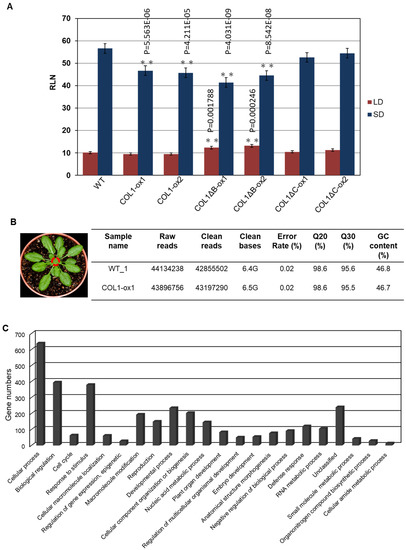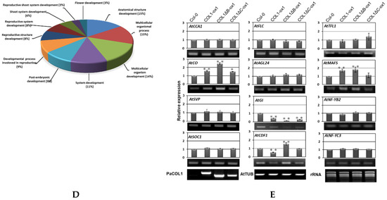 To further evaluate the abundance of target mRNAs mediated by PaCOL1 and unravel the molecular mechanism regulated by this gene, we analyzed transcriptome of shoot apex from 40-day-old SD-grown transgenic plants with the Illumina HiSeq 4000 platform (Novogene, Hong Kong). After filtering, we obtained more than 42,000,000 clean reads (Figure 4B). Relative fold change was calculated by comparing the RNA sequencing (RNAseq) data for COL1-ox1 and WT plants grown under SD conditions, with relative change of ≥2-fold considered significantly different. We identified 1370 upregulated and 1269 downregulated genes in COL1-ox1 versus WT plants (Table S1). On Gene Ontology (GO) analysis (http://geneontology.org/), the genes upregulated in COL1-ox1 were classified into 22 groups (Figure 4C). For annotated genes (n = 234) involved in the developmental process, we found 48 (3% in upregulated dataset) corresponding to the flower-development–associated process (Figure 4D). In addition, we found 78 upregulated genes including MYBs, MADS-box proteins, bZIPs, ATPases, helicases, ubiquitination enzymes (UEs), and zinc-finger proteins as putative flowering-regulation candidate genes [47,48,49,50]. Thus, PaCOL1 may affect transcript levels of flowering-related Arabidopsis genes under SD conditions.