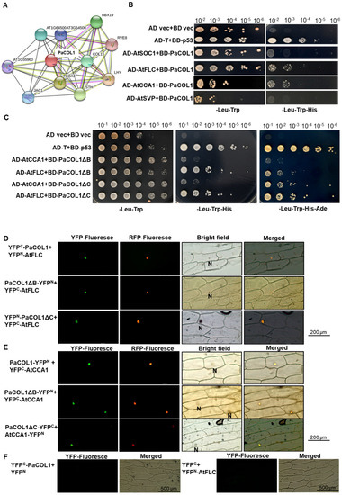 Identification of PaCOL1 and candidate protein interactions. (A) Analysis using STRING software for the candidate proteins that interacted with PaCOL1. (B) Y2H assay of the interaction between PaCOL1 with AtFLC and AtCCA1. The pGBKT7-53 and pGADT7-T interaction was a positive control. The empty vector interaction was a negative control. (C) Y2H assay of the interaction between PaCOL1 truncated proteins (PaCOL1ΔB and PaCOL1ΔC) and AtFLC and AtCCA1, respectively. (D) BiFC assay of the interaction between PaCOL1 and truncated proteins (PaCOL1ΔB and PaCOL1ΔC) and AtFLC. (E) BiFC assay of the interaction between PaCOL1 and truncated proteins (PaCOL1ΔB and PaCOL1ΔC) and AtCCA1. (F) The interactions of YFPC-PaCOL1 with YFPN or YFPC with YFPN-AtFLC were used for control. eIF4AIII-RFP protein was used as a nucleus indicator. N indicates the nucleus.