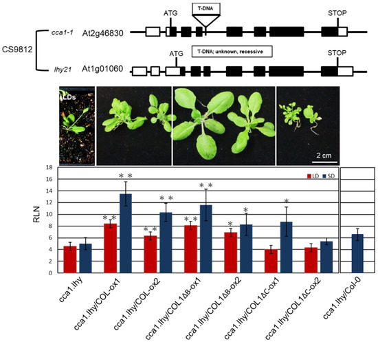 Complementation analysis of ccal.lhy double mutant transformed with PaCOL1. Flowering time of cca1.lhy, cca1.lhy/COL1-ox1, cca1.lhy/COL1-ox2, ccal1lhy/COL1ΔB-ox1, cca1.lhy/COL1ΔB-ox2, cca1.lhy/COL1ΔC-ox1, and cca1.lhy/COL1ΔC-ox2 plants grown under LD and SD conditions. The cca1.lhy/Col-0 hybrid progenies grown under SD conditions were used as control. Rosette leaf numbers (RLN) were counted and compared. Data are mean ± SE from three independent experiments (25 plants in each test). ”**” means P-value <0.01 compared with the cca1.lhy double mutant.