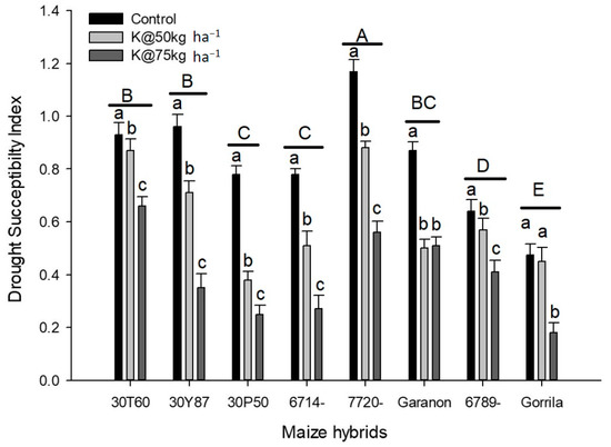 The drought susceptibility index was the highest in maize hybrid “S-7720” and lowest in maize hybrid “Gorrila”. The highest drought susceptibility index was recorded with potassium application at 75 kg ha−1 which was followed by potassium application at 50 kg ha−1 in all studied hybrids except the Gorilla hybrid. For the DK-Garamon hybrid, the drought susceptibility index for potassium application at 50 kg ha−1 was statistically similar to the control treatment (Figure 1).
