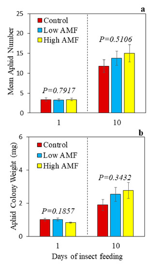 Figure 1. Potato aphid (Macrosiphum euphorbiae) (a) number per colony (per plant) and (b) weight per colony after one and ten days of herbivory on non-mycorrhizal potato plants (Solanum tuberosum) (Control), plants with a low level of AM fungal root colonization (Low AMF), and plants with a high level of AM fungal root colonization (High AMF). Values represent the mean of seven biological replicates ± SEM. A p ≥ 0.05 indicates no statistical significance based on ANOVA.