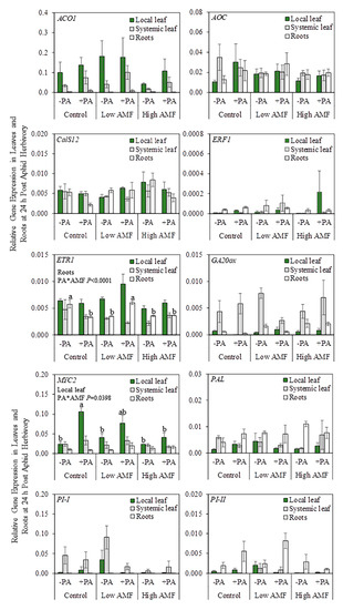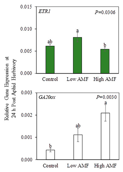 Figure 4. Relative gene expression in local leaf (green bar) and roots (white bar) after 24 h herbivory by potato aphids (Macrosiphum euphorbiae) on potato plants (Solanum tuberosum). The PA*AMF interaction was not significant in the two-factor ANOVA, but AM fungal root colonization as a main factor had a significant effect (AMF p ≤ 0.05) on ETR1 and GA20ox gene expression. Values represent the mean ± SEM (n = 6 for Control/Low AMF/High AMF). The p-values from Table S1 were used to generate this figure. Different letters indicate significant difference among groups based on the Tukey–Kramer test (p ≤ 0.05). Control = non-mycorrhizal plants; Low AMF = plants with a low level of AM fungal root colonization; High AMF = plants with a high level of AM fungal root colonization. ETR1 = ETHYLENE RECEPTOR 1; GA20ox = GIBBERELIC ACID 20-OXIDASE.