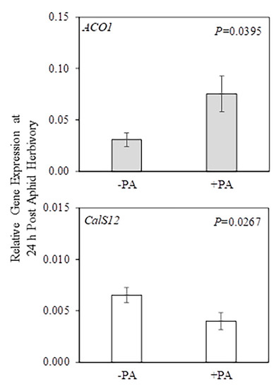Figure 3. Relative gene expression in systemic leaf (gray bar) and roots (white bar) after 24 h herbivory by potato aphids (Macrosiphum euphorbiae) on potato plants (Solanum tuberosum). The PA*AMF interaction was not significant in the two-factor ANOVA, but potato aphid herbivory as a main factor had a significant effect (PA p ≤ 0.05) on ACO1 and CalS12 gene expression. Values represent the mean ± SEM (n = 9 for −PA/+PA). The p-values from Table S1 were used to generate this figure. PA = potato aphid. ACO1 = AMINOCYCLOPROPANE-1-CARBOXYLATE OXIDASE 1; CalS12 = CALLOSE SYNTHASE 12.