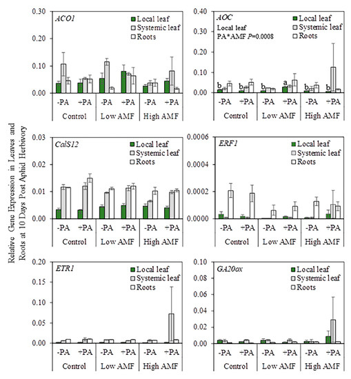 Figure 5. Relative gene expression in local leaf, systemic leaf, and roots after 10 days of herbivory by potato aphids (Macrosiphum euphorbiae) on potato plants (Solanum tuberosum). Non-infested non-mycorrhizal plants (−PA Control); potato-aphid-infested non-mycorrhizal plants (+PA Control); non-infested plants with a low level of AM fungal root colonization (−PA Low AMF); potato-aphid-infested plants with a low level of AM fungal root colonization (+PA Low AMF); non-infested plants with a high level of AM fungal root colonization (−PA High AMF); and potato-aphid-infested plants with a high level of AM fungal root colonization (+PA High AMF). The only PA*AMF interactions that were significant (PA*AMF p ≤ 0.05) in the two-factor ANOVA were for AOC and PI-I in local leaves. One-factor ANOVA followed by the Tukey-Kramer test was used when the interaction term was significant. Different letters indicate significant difference among treatments based on the Tukey–Kramer test (p ≤ 0.05). Values represent the mean ± SEM of three biological replicates and two technical replicates per treatment. The p-values from Table S2 were used to generate this figure. ACO1 = AMINOCYCLOPROPANE-1-CARBOXYLATE OXIDASE 1; AOC = ALLENE OXIDE CYCLASE; CalS12 = CALLOSE SYNTHASE 12; ERF1 = ETHYLENE RESPONSE FACTOR 1; ETR1 = ETHYLENE RECEPTOR 1; GA20ox = GIBBERELIC ACID 20-OXIDASE; MYC2 = BASIC-HELIX-LOOP-HELIX TRANSCRIPTION FACTOR; PAL = PHENYLALANINE AMMONIA LYASE; PI-I = POTATO TYPE I PROTEASE INHIBITOR; PI-II = POTATO TYPE II PROTEASE INHIBITOR.