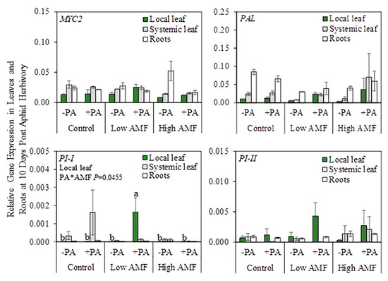 Figure 2. Relative gene expression in local leaf, systemic leaf, and roots after 24 h of herbivory by potato aphids (Macrosiphum euphorbiae) on potato plants (Solanum tuberosum). Non-infested non-mycorrhizal plants (−PA Control); potato-aphid-infested non-mycorrhizal plants (+PA Control); non-infested plants with a low level of AM fungal root colonization (−PA Low AMF); potato-aphid-infested plants with a low level of AM fungal root colonization (+PA Low AMF); non-infested plants with a high level of AM fungal root colonization (−PA High AMF); and potato-aphid-infested plants with a high level of AM fungal root colonization (+PA High AMF). The only PA*AMF interactions that were significant in the two-factor ANOVA were for ERT1 (roots) and MYC2 (local leaf). One-factor ANOVA followed by the Tukey–Kramer test was used when the interaction term was significant (PA*AMF p ≤ 0.05). Different letters indicate significant difference among treatments based on the Tukey–Kramer test (p ≤ 0.05). Values represent the mean ± SEM of three biological replicates and two technical replicates per treatment. The p-values from Table S1 were used to generate this figure. ACO1 = AMINOCYCLOPROPANE-1-CARBOXYLATE OXIDASE 1; AOC = ALLENE OXIDE CYCLASE; CalS12 = CALLOSE SYNTHASE 12; ERF1 = ETHYLENE RESPONSE FACTOR 1; ETR1 = ETHYLENE RECEPTOR 1; GA20ox = GIBBERELIC ACID 20-OXIDASE; MYC2 = BASIC-HELIX-LOOP-HELIX TRANSCRIPTION FACTOR; PAL = PHENYLALANINE AMMONIA LYASE; PI-I = POTATO TYPE I PROTEASE INHIBITOR; PI-II = POTATO TYPE II PROTEASE INHIBITOR.