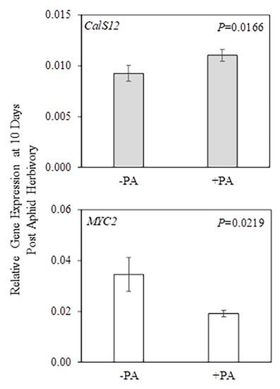 Figure 6. Relative gene expression in systemic leaf (gray bar) and roots (white bar) after 10 days of herbivory by potato aphids (Macrosiphum euphorbiae) on potato plants (Solanum tuberosum). The PA*AMF interaction was not significant in the two-factor ANOVA, but potato aphid herbivory as a main factor had a significant effect (PA p ≤ 0.05) on CalS12 and MYC2 gene expression. Values represent the mean ± SEM (n = 9 for −PA/+PA). The p-values from Table S2 were used to generate this figure. PA = potato aphid. CalS12 = CALLOSE SYNTHASE 12; MYC2 = BASIC-HELIX-LOOP-HELIX TRANSCRIPTION FACTOR.