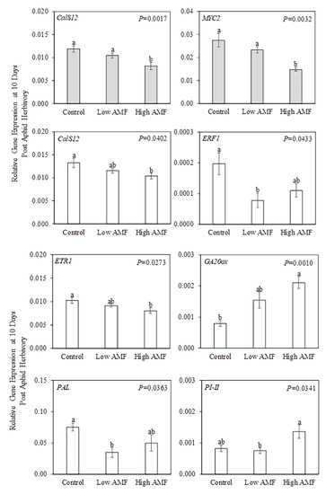 2.3. Plant Gene Expression after 10 Days of Potato Aphid Herbivory at Two Levels of AM Fungal Root Colonization