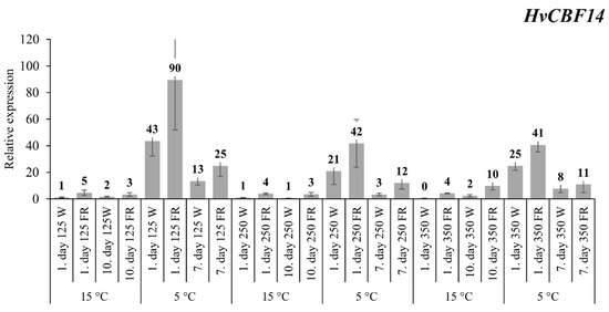 Using the ΔΔCt method, we evaluated the samples grown under low light intensity and white light at 15 °C and were considered as the controls. FR supplementation at low light intensity (125 photosynthetically active radiation (PAR)) caused a 5-fold increase in the HvCBF14 transcript level at 15 °C on the first day of the experiment, but after ten days this difference faded to 3-fold (Figure 1). After one day at a low 5 °C temperature, there was a large increase in HvCB14 gene expression (about 43-fold) even under white light illumination, but as a result of FR supplementation, this increase was even doubled. By the seventh day of the treatment, the expression levels had fallen, but the elevated pattern remained the same. At normal and high light intensity, 250 and 350 PAR respectively, similar gene expression patterns were obtained. The only important differences were the following: lower relative levels were achieved compared to the low-intensity results after cold exposure, but there were clear differences between the treated and untreated samples at all times.