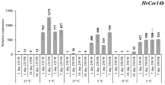 At low 125 PAR incident light intensity, the transcript level of the HvDHN5 gene doubled as a result of FR supplementation on the first day at 15 °C, but this difference diminished after 10 d of the treatment (Figure 3). This tendency was also evident at 5 °C. Based on the results from samples treated at higher light intensities, it can be generally stated that neither the temperature nor the light treatments had a significant effect on the gene expression pattern. Of course, the gene expression levels were permanently higher in the samples originating from the lower temperature (5 °C).
