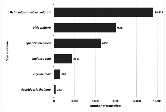 There is currently no published genome for any Tamarix species; therefore, analyses of the de novo reference transcriptome was conducted using Arabidopsis thaliana, other woody species and two domesticated species of the order Caryophylalles (Spinacia oleracea [spinach] and B. vulgaris [sugar beet]) [45,46,47]. Tamarix showed the greatest homology to the double haploid sugar beet line KWS2320, with over 14,000 homologs.