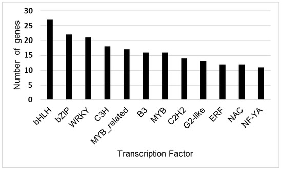 CD-Hit analysis identified a total of 198,679 unique transcripts. Prediction of transcription factors for these unique transcripts with PLANTTFDB found 35 transcription factor gene families (Figure 2, Table S3). The largest numbers of unique genes predicted by Blast2GO and Plant TFDB were for the larger transcription factor families, including bHLH, bZIP, WRKY, MYB and NAC.