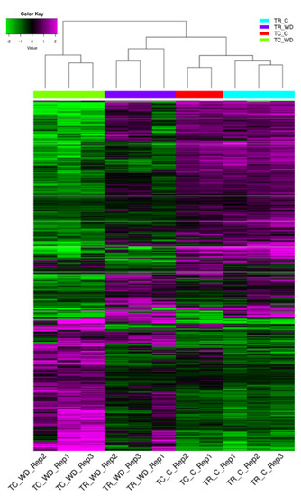 Differentially expressed genes from all pairwise comparisons for T. chinensis (TC) and T. ramosissima (TR) in well-watered (C) and water deficit (WD) treatments. Differentially expressed values for all genotypes and treatments were determined using a Bioconductor package edgeR (version 3.8.6) with a false discovery rate (FDR) = 0.001 and fold change >2. Magenta color denotes genes up-regulated and green denotes genes down-regulated in WD relative to C in both TC and TR (scale is in the upper left of the figure). Rep1, 2, or 3 denotes the biological replicate number. There are three biological (n = 3) replicates in TC_WD, TR_WD, and TR_C, and two biological replicates (n = 2) in TC_C.