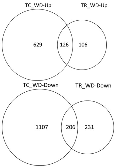 Water deficit response in T. chinensis and T. ramosissima seedlings. Differentially expressed genes (FDR 0.005 and log fold change ≥1 were identified for TC_well-watered (C) versus TC_water deficit (WD) and TR_C versus TR_WD). T. chinensis water deficit up- or down-regulated (TC_WD-Up or -Down) and T. ramosissima (TR_ WD-Up or -Down) indicate the number of differentially expressed genes that are up- or down-regulated in the water deficit treatment (WD) relative to the well-watered control (C).