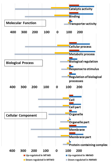 The biological processes category contained the largest number of genes (Table S5). The major categories in common between species were cellular process, metabolic process, biological regulation, response to stimulus and regulation of biological processes, and they showed a similar proportion of differentially up- and down-regulated genes in each species (Figure 6).