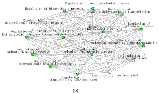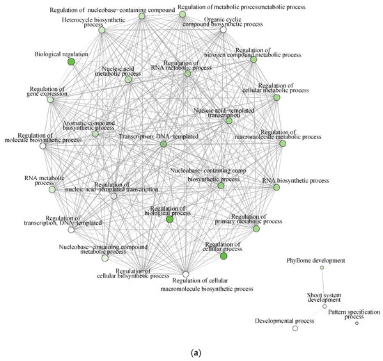 (a) Significantly enriched biological processes for T. chinensis genes up-regulated under water deficit treatment (TCWD) relative to its well-watered control. Significant enrichment networks were performed using DEG in the iGraph R package in the ShinyGO web server. Networks consist of nodes and lines connecting the nodes. Nodes are circles, which denote the different biological process categories. The color of the circle denotes the direction of regulation of the genes belonging to each enriched biological process in the network. Lines denote the interactions, which are the genes that are common between any two biological processes. Darker green color in the circles indicates greater up-regulation of genes. (b) Significantly enriched biological processes for T. ramosissima genes up-regulated under water deficit treatment (TRWD) relative to its well-watered control. Significant enrichment networks were performed using DEG in the iGraph R package in the ShinyGO web server. Network consists of nodes and lines connecting the nodes. Nodes are circles, which denote the different biological process categories. The color of the circle denotes the direction of regulation of the genes belonging to each enriched biological process in the network. Lines denote the interactions, which are the genes that are common between any two biological processes. Green color in the circles indicates greater up-regulation of genes. Enriched GO categories down-regulated in TRWD were negative regulation functional categories (cellular processes, gene expression, signaling and RNA biosynthesis) and functional categories related to the positive regulation of chromatin and histone modifications (Table S6d).
