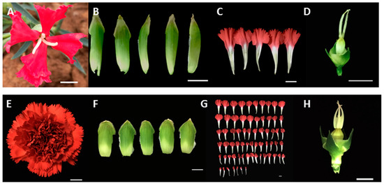 Characteristics of single (‘Da hong’) and double (‘Master’) flower phenotype carnations. (A–D) represent flower, sepals, petals, and carpel of ‘Da hong’, respectively. (E–H) represent flower, sepals, petals, and carpel of ‘Master’, respectively. ‘Da hong’ and ‘Master’ with petals of 5 and more than 40, respectively. Bar = 1 cm.