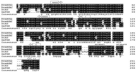 Protein sequence comparison of DcaAGa, DcaAGb, and the AG-related MADS domain proteins in Arabidopsis thaliana and Antirrhinum majus. The MADS domain, K domain, and I domain are marked with an arrow box. The AG motifs I and II in the C terminal region are boxed, highly conserved for AG-like protein.