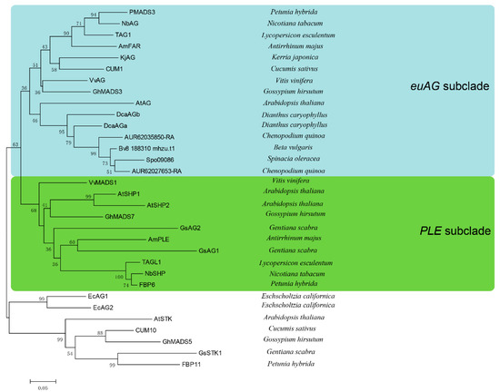 Phylogenetic analysis showed that DcaAGa and DcaAGb all fall into the euAG branch (Figure 3). Interestingly, our result was consistent with the previous study findings that AG homologs from Caryophyllales belonged to only the euAG subclade rather than the PLE subclade [7,31,32]. We identified one, one, and two C-class genes from B. vulgaris, S. oleracea and C. quinoa, respectively, and found that they all belonged to the euAG subclade (Figure 3).