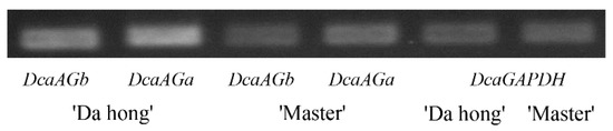 Semi-quantitative PCR analysis indicated that the expression levels of DcaAG genes were lower in the double flower phenotype carnation than that in the single flower phenotype carnation, and that the expression patterns of DcaAGa and DcaAGb in these two flower phenotype carnations were basically consistent, while the expression of the former was slightly higher than that of the latter (Figure 4).