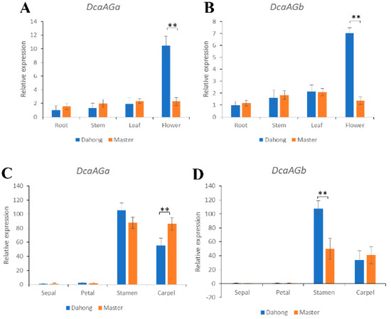 Quantitative PCR analysis of two DcaAG genes at different tissues (A,B) and floral organs (C,D) in single and double flower phenotype carnations. In different tissues, the expression of DcaAGa (A) and DcaAGb (B) were obviously different in the flower bud, and no significant difference was detected in the root, stem and leaf between two flower phenotype carnations. In floral organs, the expression of DcaAGa (C) and DcaAGb (D) were exclusively expressed in the stamen and carpel, and low expression levels were detected in the sepal and petal. DcaAGa (C) and DcaAGb (D) showed significant differential expression in the carpel and stamen between two flower phenotype carnations, respectively. ** indicates p < 0.01 by student’s t-test.