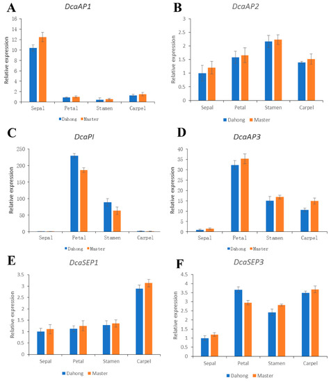 In order to investigate the expression levels of the floral organ identity genes between single and double flower phenotype carnations quantitative RT-RCR was performed to analyze the expression pattern of DcaAP1, DcaAP2, DcaAP3, DcaPI, DcaSEP1, and DcaSEP3. DcaAP1 had especially higher expression in the sepal than that in the petal, stamen, and carpel, and expressed slightly lower in all floral organs of the single flower phenotype carnation compared to that of the double flower phenotype carnation (Figure 6A). DcaAP2 expressed in all floral organs stably and was slightly lower in all floral organs of the single flower phenotype carnation than that of the double flower phenotype carnation (Figure 6B). DcaPI and DcaAP3 both had higher expression in the second and third whorls than that in the first and fourth whorls, and there was no significant difference in expression between single and double flower phenotype carnations (Figure 6C,D). The expression pattern of DcaSEP1 and DcaSEP3 were relatively smooth in all floral organs between single and double flower phenotype carnations (Figure 6E,F). The huge difference of expression in C-class genes and no significant difference of expression in A-, B-, and E-class genes between single and double flower phenotype carnations indicated that the C-class genes may result in the differential characteristics between single and double flower phenotype carnations. A previous study on Kerria japonica revealed that repressing the expression of Df-KjAG could affect the expression of other floral organ identity genes, such as KjAGL2, KjAGL9, KjAP1, KjAP2, KjAP3, and KjPI in the double flower K.japonica [33], which is different from the situation in carnation.