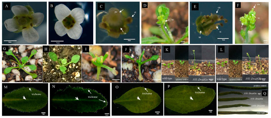 We investigated the function of DcaAG genes in flower initiation and development by overexpressing DcaAG genes in Arabidopsis. Twenty independent 35S::DcaAGa and 33 independent 35S::DcaAGb transgenic Arabidopsis plants were obtained. The expression levels of DcaAGa and DcaAGb in the transgenic Arabidopsis lines were tested by semi-quantitative PCR. Both DcaAG genes were found to express in transgenic plants (Figure S1). The 15 independent 35S::DcaAGa and 14 independent 35S::DcaAGb transgenic plants showed severe phenotypic alteration (Figure 7), namely, their petals became significantly shorter and even almost disappeared, and a large number of deformed carpels were observed (Figure 7C–F). All the transgenic plants displayed abnormal growth of narrow and curly leaves in the early developmental stage (Figure 7I–J). These transgenic plants flowered earlier than the wild type plants and the positive control group (Figure 7K,L). All the transgenic plants showed a significant decrease in trichome on the leaf surface margin and vein (Figure 7O–P). The seeds of 35S::DcaAGa and 35S::DcaAGb transgenic lines were sterile or with low activity, and their siliques were shorter, wrinkled, and convex near the top (Figure 7Q). These results indicated that overexpression of DcaAG genes in Arabidopsis lead to a series of effects on Arabidopsis development, especially on flower development.
