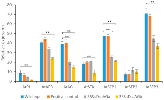 Quantitative PCR analysis of AtPI, AtAP3, AtAG, AtSTK, AtSEP1, AtSEP2, and AtSEP3 in wild type, positive control group, 35::DcaAGa and 35::DcaAGb transgenic Arabidopsis. The expression of AtPI, AtAP3, AtAG, AtSTK, AtSEP1, and AtSEP3 in transgenic Arabidopsis show a significant difference, compared to the wild type and positive control group plant. ** indicates p < 0.01 by student’s t-test. Positive control represents the plants are transformed with pCAMBIA2300s vector.